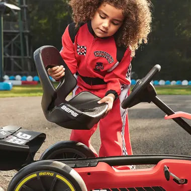 Das markante, sportliche Lenkrad, EVA-Reifen, die nie einen Platten bekommen, der coole Schalensitz und die Pendelachse machen das Gokartfahren zu einem großen Spaß. Mit seinem tiefen Schalensitz ist der BERG Reppy das erste Gokart für kleine Kinder mit einem echt niedrigen Gokart-Einstieg. Wenn Kinder mit dem Reppy eine Fahrt über den Bürgersteig unternehmen, sind alle Augen auf sie gerichtet.
